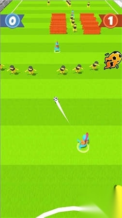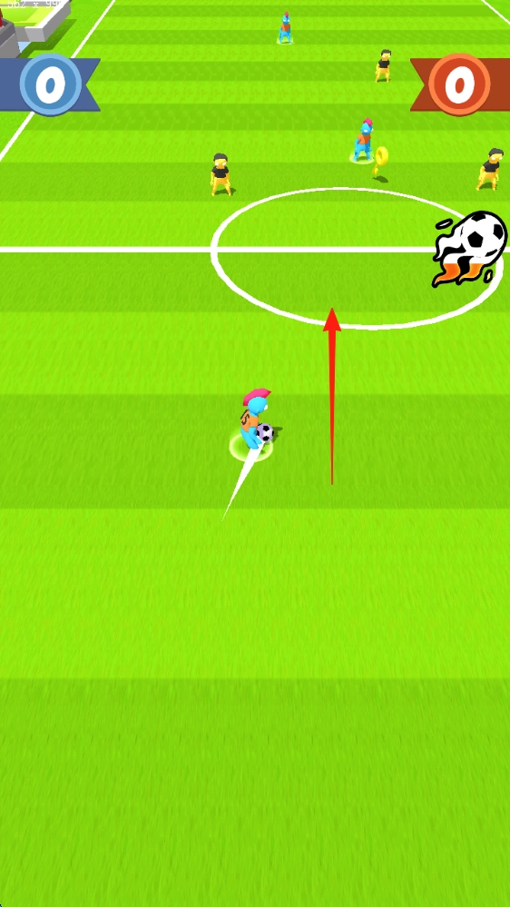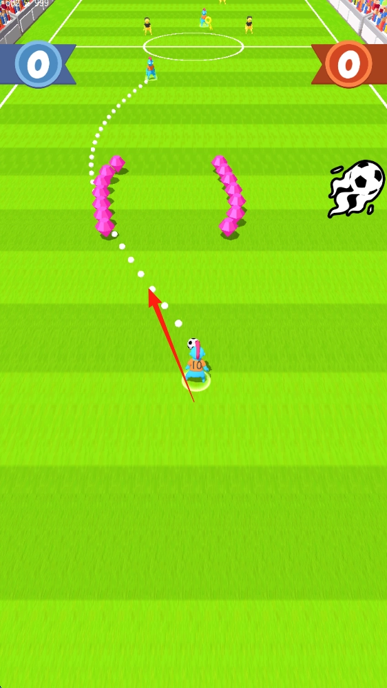 游戏中需操控角色沿白色轨迹带球前进,过程中要巧妙避开各类障碍,并尽可能收集火焰足球这类道具;界面上会实时呈现双方当前比分(初始为0 - 0),该玩法十分考验玩家操作的精准程度。