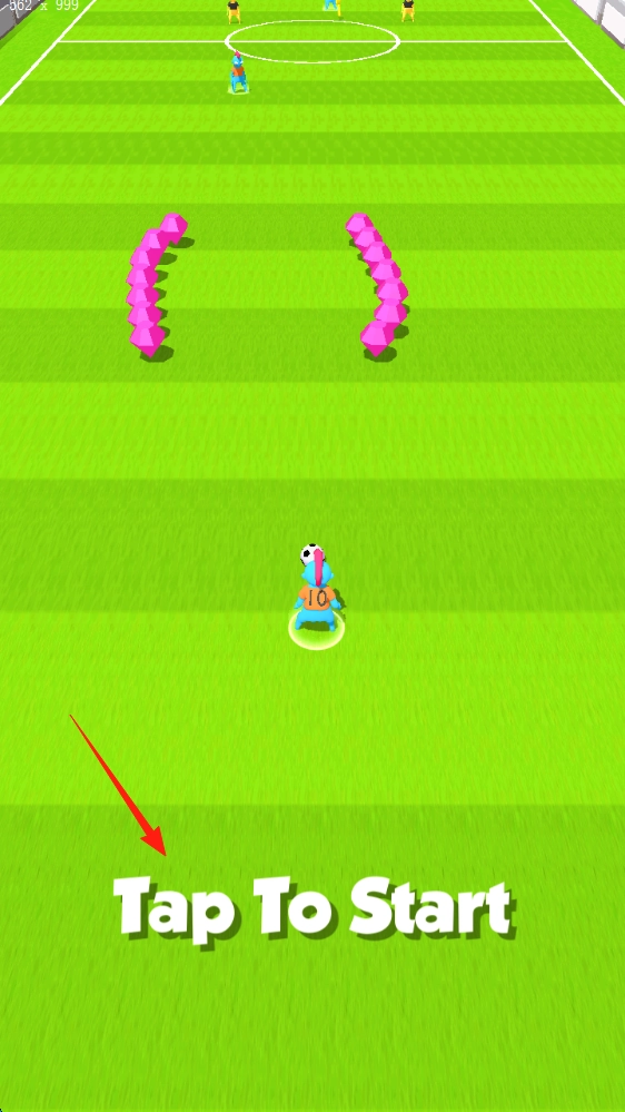 游戏开始时会显示“TapToStart”的开局引导,点击即可启动;身着蓝色队服的10号球员位于足球场上,需要带球突破粉色障碍物,朝着对方半场的方向推进。