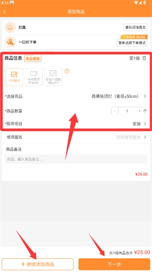 我们以灯具安装为例,在填写好商品的相关信息以及对应的数量之后,就可以选择继续添加商品,或者直接进入到下一步操作。