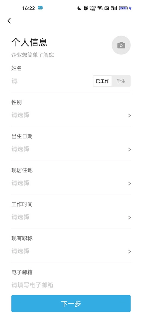 3、选择好之后点击下一步,然后我们会来到个人信息页面,填写自己个人信息、现有职称、电子邮箱,然后在点击下一步;