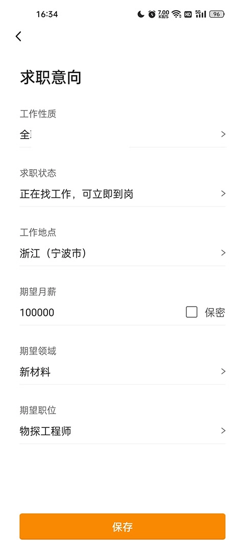 6、最后填写求职意向,将工作性质、工作地点、期望薪资、期望领域、期望职位逐个详细的写出来;