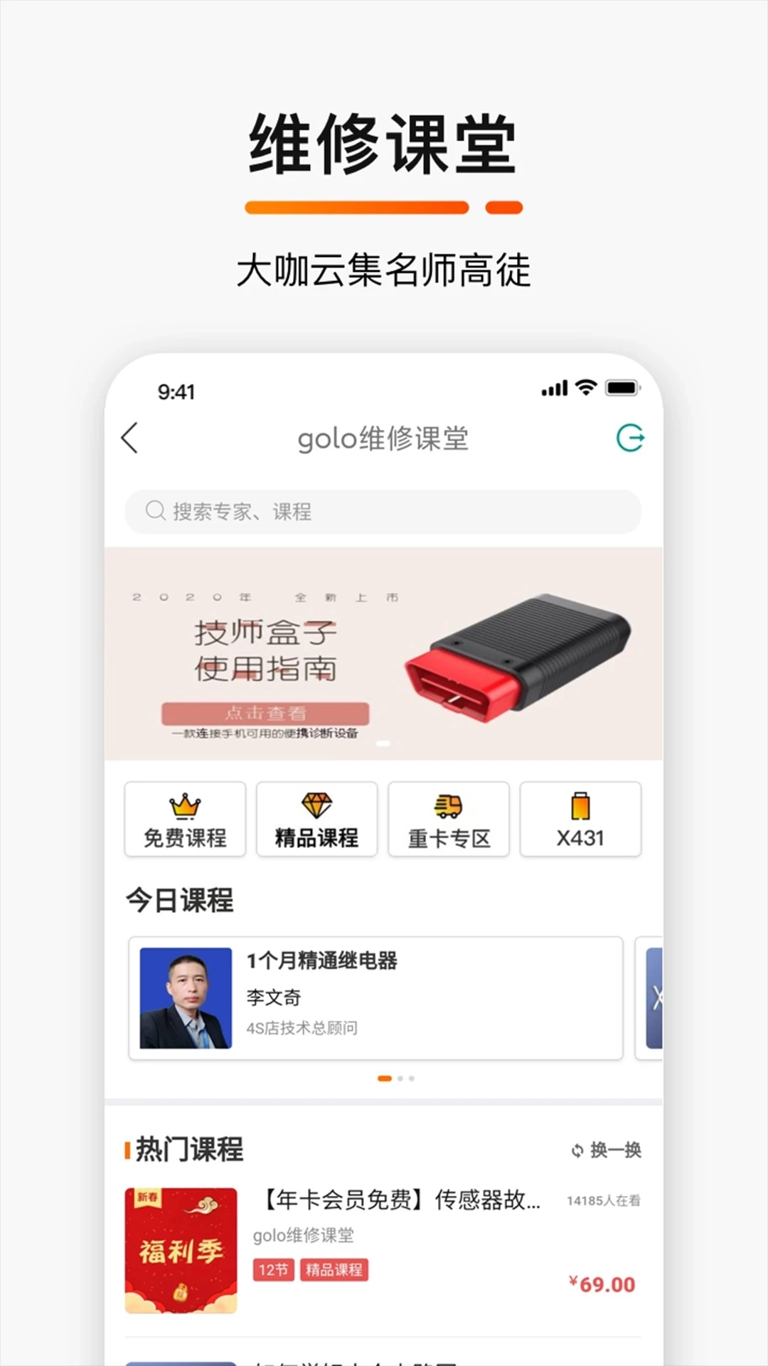 golo汽修大师是一款备受欢迎的汽车维修软件,配备了十分智能的汽车诊断工具,能让用户随时随地轻松完成汽车扫描,查看各类汽车信息,助力用户便捷地进行汽车维修与保养。此外,软件还具备丰富多样的功能,用户可以在这里获取不同类型的汽车修理相关课程资源,跟随课程轻松学习更多汽车修理技能与方法,进而提升自身工作效率,更高效地为客户诊断汽车,更清晰地掌握汽车故障状况,以便开展精准维修。有相关需求的用户,欢迎使用这款软件。