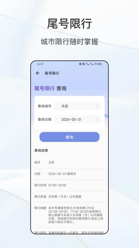 通过尾号限行功能查询指定城市限行规定。