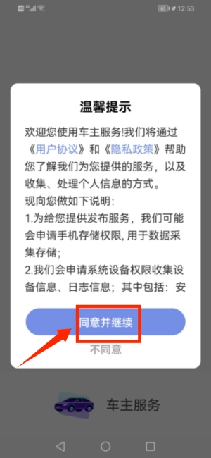首次启动应用,请在温馨提示弹窗点击同意并继续。