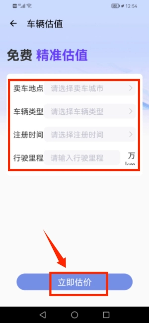 在车辆估值页面填写信息获取估价结果。