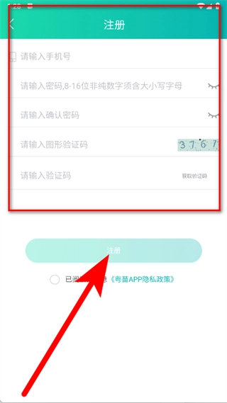 在注册页面依次填写手机号、密码、图形验证码以及验证码等信息,勾选相关协议条款后,点击注册按钮即可完成注册操作。