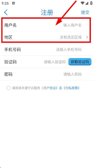 接着在注册页面,填写用户名、选定地区、输入手机号码。