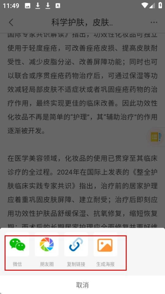 可以点击【微信】【朋友圈】【复制链接】【生成海报】等选项来分享护肤相关的内容。