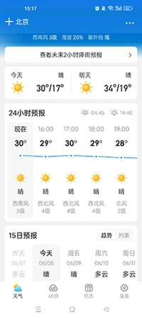 丰富天气信息:提供实时天气数据、未来24小时天气预报、15日天气预报,以及空气质量指数、空气污染指数、PM2.5、风力、温度、湿度、日出日落时间、气压、能见度等信息。