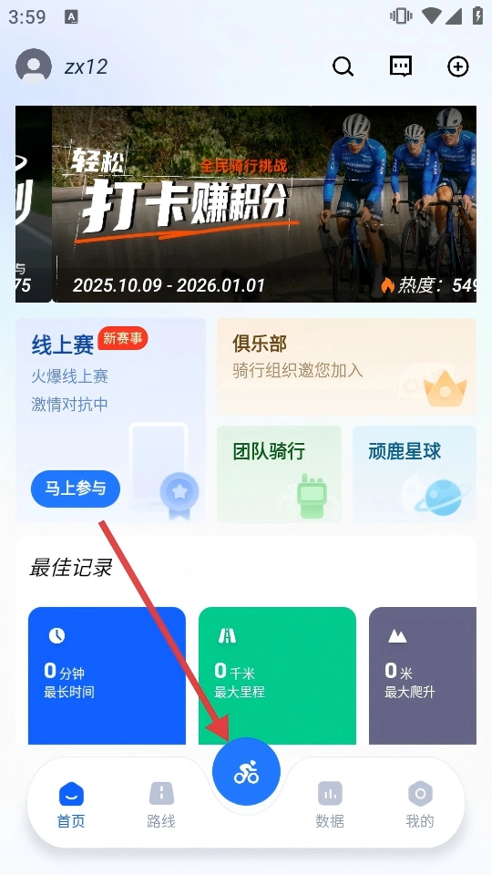 在软件首页点击底部的【骑行】按钮,就能进入骑行模式,同时还可以参与线上赛、查看最佳记录,开启你的骑行之旅。