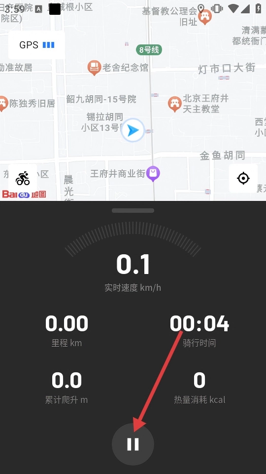 在骑行的过程中,界面会实时展示速度、里程等相关数据,若需要暂时中断骑行记录,只需点击【暂停】按钮即可。