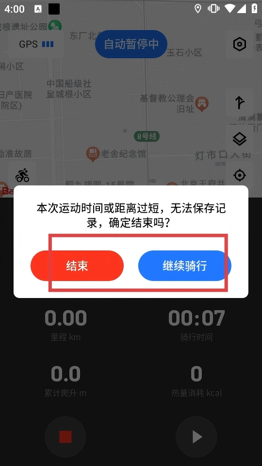当运动时长或里程不足时,结束运动后系统会提示无法保存该条记录,此时你可以根据自身需求,选择点击【结束】按钮终止运动,或选择【继续骑行】来延长运动时间以满足记录条件。