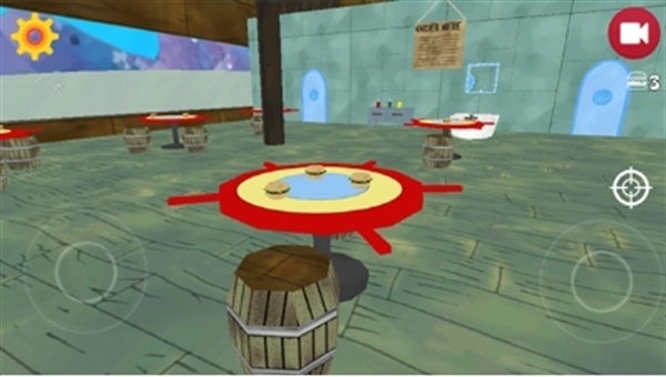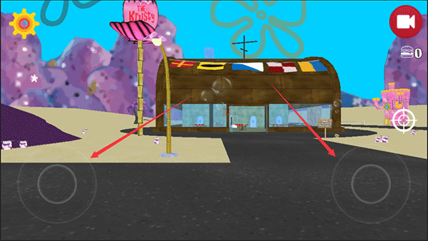 1、进入游戏会出生到蟹堡王的门口,我们可以通过左侧的轮盘控制海绵宝宝移动,右侧的轮盘控制视角;