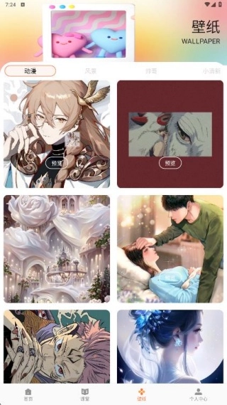 壁纸页面涵盖动漫等风格图片,可快速完成壁纸。