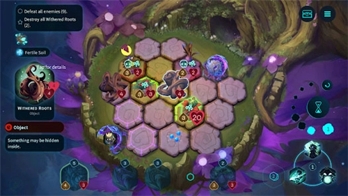 战斗前期抽卡时,手牌可以随意刷新;开局只有你的英雄单位会出现在棋盘上,每个角色单位都带有“正面弧线”标识,这代表着它朝向的位置。当敌人从六角棋格中你单位正面弧线所指的方向发动进攻时,你的单位会自动展开反击,同理,在你方单位攻击敌人时,这一机制也同样适用。