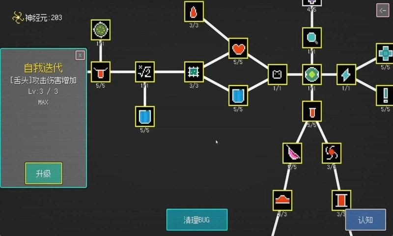 技能升级机制:青蛙可通过吞噬虫子来提升自身算力,以此实现等级进阶;在此过程中,神经树的节点会逐步解锁,青蛙的战斗能力与生存属性也将随之得到强化。
