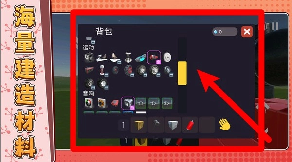 背包界面里呈现着运动、音响等各类组件,玩家可以借助滚动列表来快速浏览和挑选材料,进而自由组装出具有个性的机械。