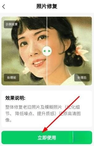 进入照片修复页面,用户可查看示例图和效果说明。