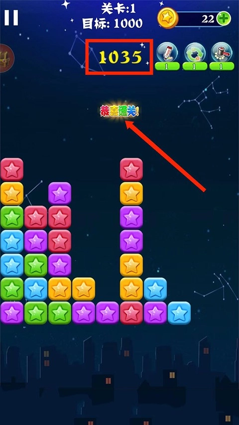 5、当【当前分数】达到或超过目标分数时,屏幕会显示【恭喜通关】的提示,以上就是消灭星星的玩法介绍,快来试试看吧。