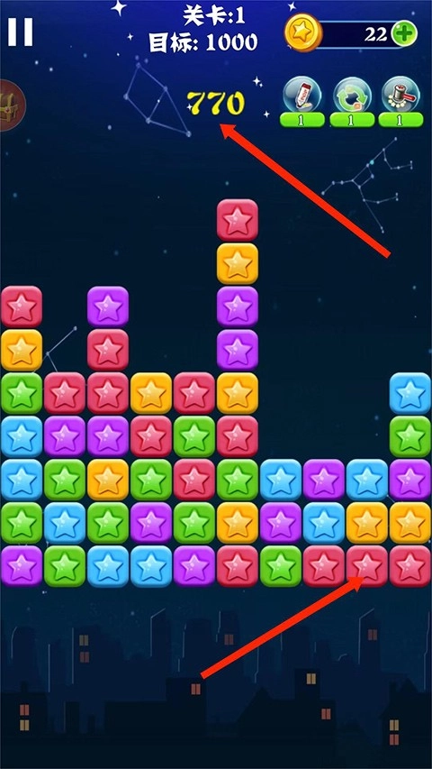 3、进入【游戏界面】后,找到两颗或三颗颜色相同的星星,点击它们就能将其消除并获得分数。