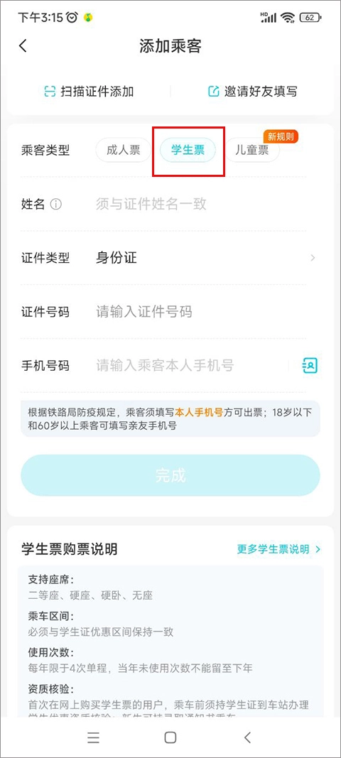 添加乘客信息时,先在乘客类型里选择学生票选项,再依次填写姓名、证件类型、证件号码、手机号码等内容,最后点击完成按钮,就能完成学生票的购买流程了。