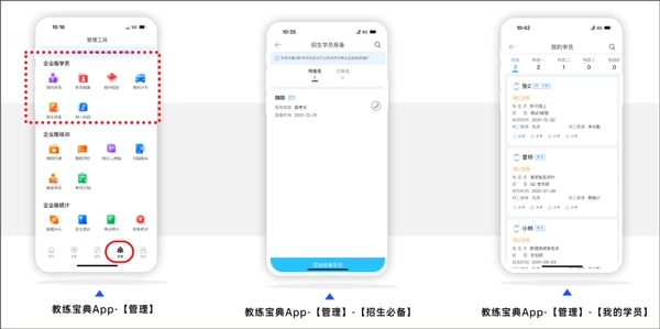 教练宝典App手机端按场景划分功能板块,方便驾校工作人员更快找到自己需要操作的模块。