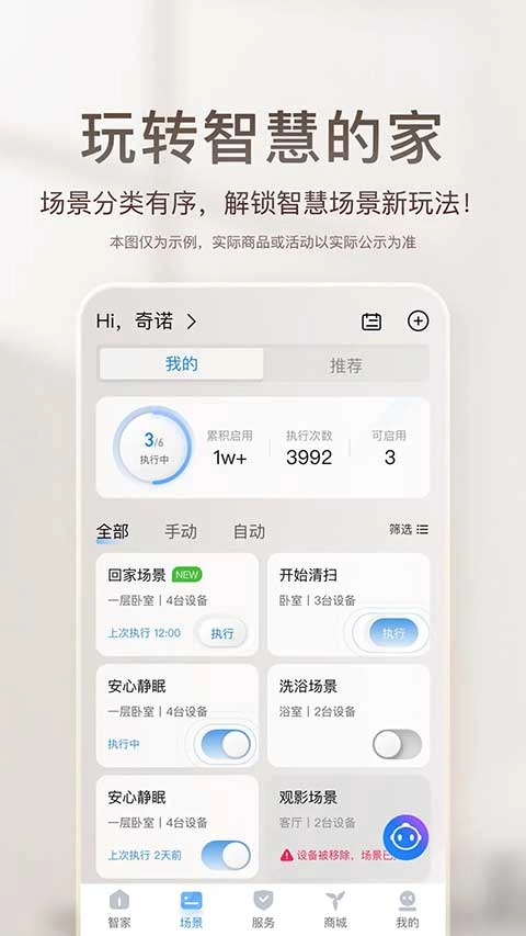 智慧场景:是智家大脑根据您的操作习惯自动生成的场景,操作简单,不需要再手动配置复杂的场景规则,只要一键开启就行