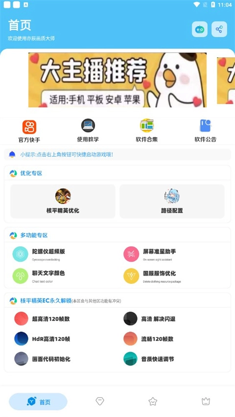 亦辰画质大师是一款专业的游戏辅助工具,丰富多样的功能模块,用户可按需自由选用,每一项功能都能为游戏体验带来深度优化。软件支持一键提升画质,同时确保游戏运行帧数稳定流畅。此外,其操作逻辑简洁直观,大幅降低了功能使用门槛,让用户能更专注于游戏本身。值得一提的是,软件还具备清晰的资源分类与高效的搜索功能,帮助用户快速定位并获取所需资源。
