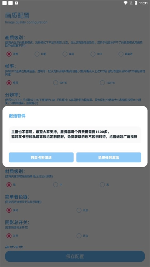 5、配置完成后保存配置他会提示你先激活软件,有两个选择:购买卡密激活和免任务激活,你选择其中一个就好。激活后就可以打开游戏体验高清的游戏乐趣!