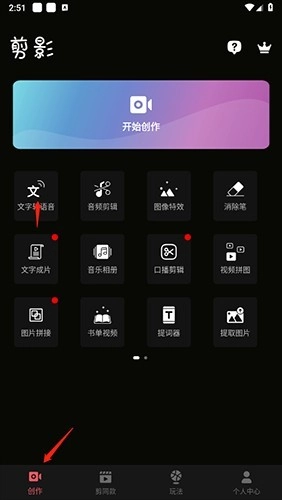 1、打开这款软件,点击底部的“创作”按钮,接着选择“文字转语音”功能。