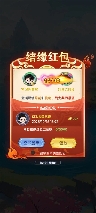 喜结良缘:领取专属结缘红包,激活情缘戒指与信物,和心仪之人缔结缘分,助力双方战力同步飙升。