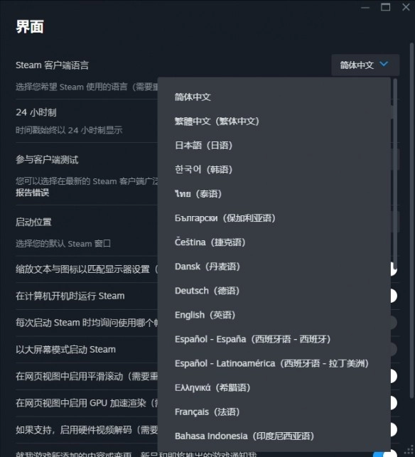 2、进入后在steam客服端语言栏目进入,选择\"简体中文\"即可。