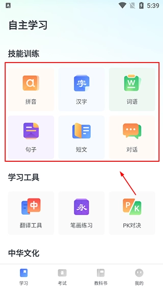 确定HSK等级后,e学中文会依据你当前的HSK等级智能推荐适配的学习内容,你既可以按照e学中文推荐的内容展开学习;也能结合测评得出的等级,主动挑选相关学习内容进行练习——涵盖AI中文课,以及字、词、句、短文朗读、场景对话等专项练习,还有HSK在线教程,另外互动PK环节还能增添学习的趣味性。