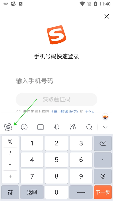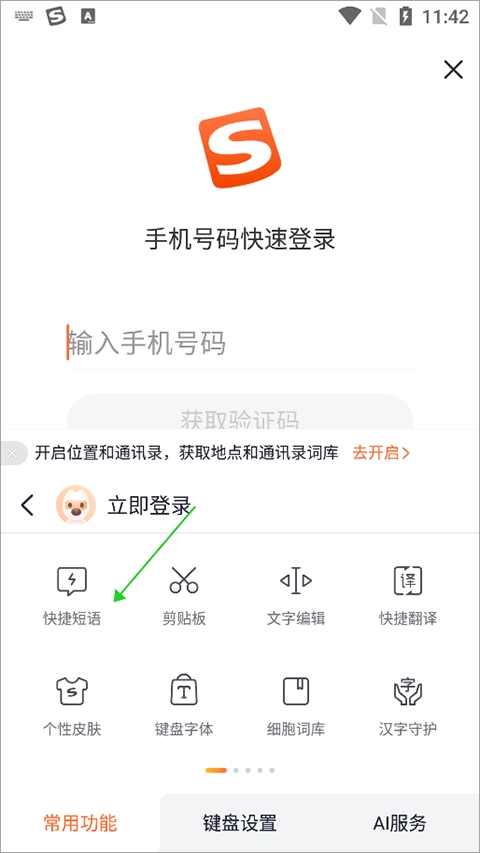 1、用户输入文字时,可在酷狗输入法键盘上点击左上角的logo图标(即下图绿色箭头所指的图标)