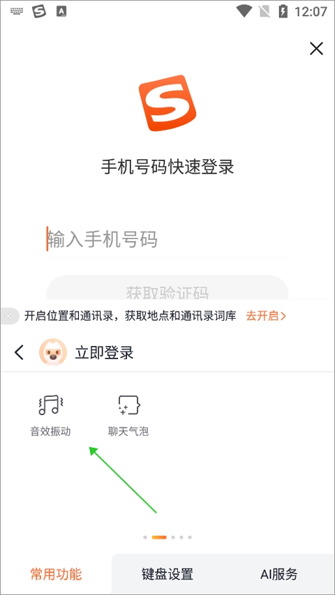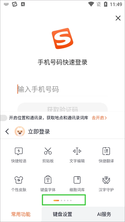 用户依然是在输入的时候点击如上一个使用教程中第一张图中的logo图标,在切换的新页面中通过向左滑动一次底部导航按钮(下图绿色方框区域)