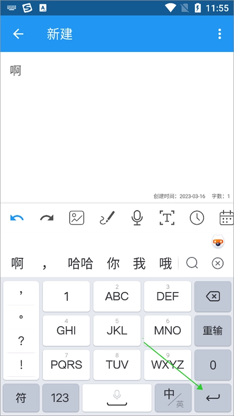 用户在输入文本时,可以在键盘上点击右下角的换行符(下图绿色箭头所指)