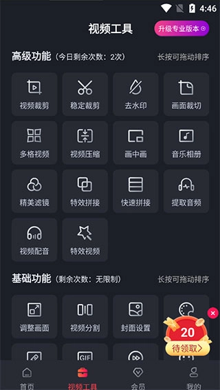 3、视频工具页面,分为高级功能、基础功能,高级功能是需要付费的;