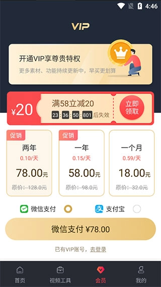 4、会员页面,会员充值可享受素材模板、高级功能的使用;