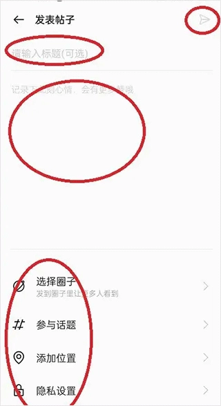 3、依次填写帖子标题、输入帖子内容、选择所属圈子、添加相关话题等,完成后点击发送图标