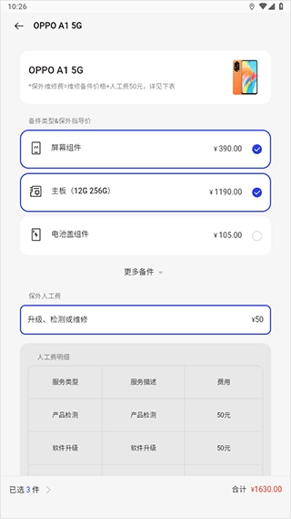4、随便点击一款机型,就会显示对应的配件价格