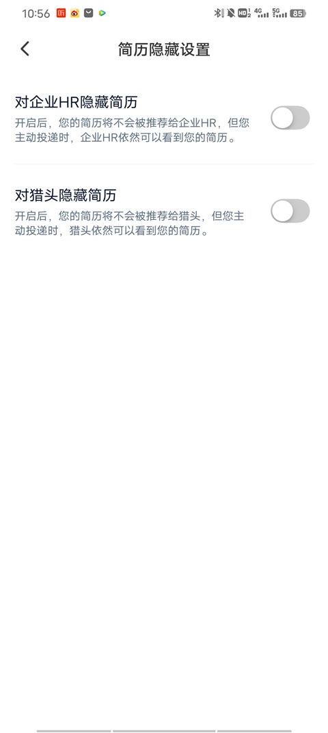 3、在简历隐私设置中,我们可以看到对企业和猎头隐藏简历,我们选择打开隐藏简历;