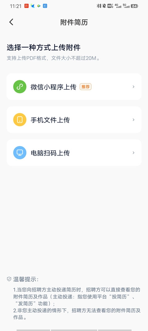 3、用户能够借助微信小程序、手机文件上传或电脑扫码等途径提交自己的附件。