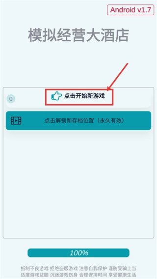 进入【模拟经营大酒店-Android-v1.7】的界面后,点击【点击开始新游戏】按钮就能启动经营环节,初始存档可以直接进入游戏流程。