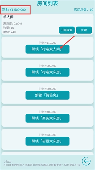 查看【资金-¥1,500,000】,支出【¥119,200】解锁【标准双人间】,丰富房型种类以提高酒店入住率和收益。