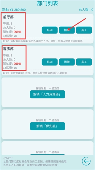 当前厅部和客房部的繁忙度均达到999%时,可点击对应部门的“招聘”按钮,通过补充员工来防止属性下降。