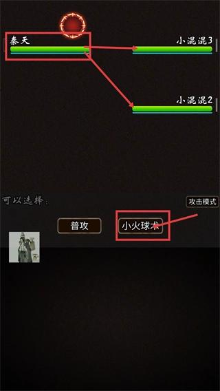 战斗时选用【小火球术】技能,借助【泰天】的属性长处,优先对【小混混3】展开攻击。