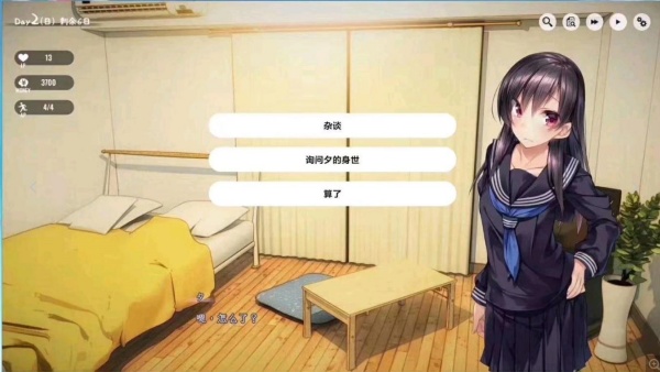 在车站遇到夕的时候不要说话,保持沉默;然后同意夕来家里(如果选择了离开,游戏结束,我就不多剧透,感兴趣的自己去试试);夕询问是否可以洗澡的时候也是保持沉默,此时体力值已达到10,在后面睡觉时就可以选了(我先告诉你们选了那个选项的后果,夕会在第二天你起床之前离开,游戏结束)