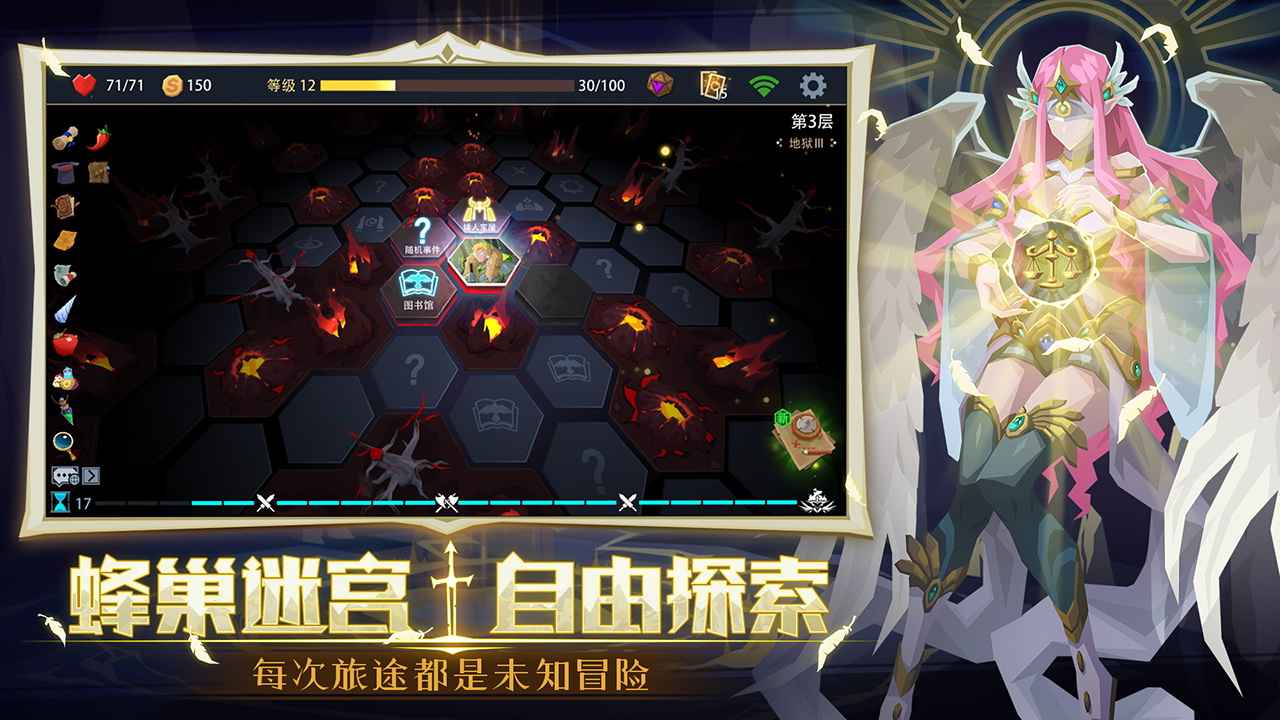 一款蜂巢地牢迷宫式roguelike的卡牌手游,玩家将会化身不同的英雄,赶在强大的恶魔到来之前,穿行于神奇秘境中探索各类事件,诸如遗忘神庙、转换祭坛、月亮井、炼金小屋等等,还有毁灭巨龙、风语女王等强大而又神秘的敌人将会陆续降临,你需要不断地努力丰富牌组、强化实力,最终战胜恶魔。