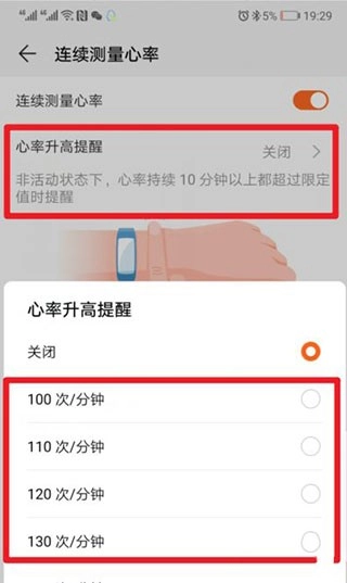同时,也能在界面里点击心率升高提醒,点击之后,选择下方对应的心率提高提醒选项,这样一来,当心率上升时,手环端就会向我们发出提醒。