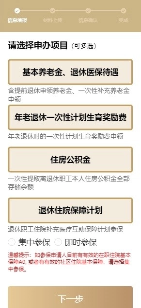 2. 基本信息填写正确后,您可选择需申办的项目。其中,“基本养老金、退休医保待遇”默认是必选项,“年老退休一次性计划生育奖励费”“住房公积金”“退休住院保障计划”等其他联办项目为可选项。
